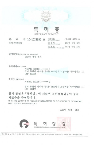 실습용 용접부스 특허증